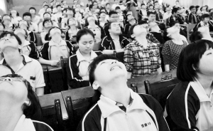 5月21日,南昌市豫章中学高三年级的学生们在心理辅导老师的带领下,做轻松愉快的减压动作。