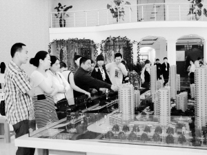 天鹏皇朝项目毗邻新火车站站前广场,区位条件良好。此次推出的22号楼位于小区中心景观带,观景效果极佳,很受市民追捧。图为开盘现场市民在观看沙盘。王永剑 摄