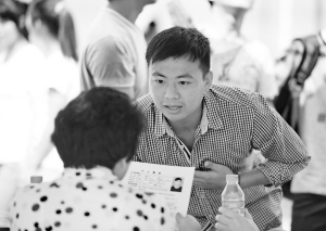 5月23日,南昌大学民营企业招聘会上,一名求职大学生在向用工单位介绍自己。