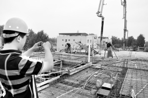本报讯 上百名工人正忙着绑扎钢筋、浇筑混凝土……十几辆运输车辆在工地上穿梭,装卸建筑材料,忙得不亦乐乎。这是5月29日记者在周口市川汇新区金域华庭项目工地看到的忙碌而紧张的施工场景。与别处不同的是,这里的施工气氛更显严肃,戴安全帽的工人作业认真,楼上楼下来回走动的管理人员同样认真,发现一点“蛛丝马迹”就立即通知工人,大家的认真劲儿让人感到这里不是一般的建筑工地,而是一处打造精品建筑的“战场”。