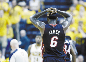 第三节场面十分胶着,领先优势数次易主。步行者队在本节末段加强了防守,斯蒂芬森在本节哨音响起之前命中一记底角高难度三分球,步行者队将优势扩大为7分。末节双方争夺进入白热化,步行者队的优势一点一点被热火队蚕食,在距比赛结束还剩6分15秒时,热火队已经把比分追平。最关键的时刻,热火队进入得分荒,在比赛最后4分54秒内竟然仅得到3分。步行者队继续强攻内线,依靠稳定的罚球逐渐把比赛带入自己的节奏。距离比赛还剩56秒时,热火队的詹姆斯因6次犯规被罚出场,热火队最终无奈缴械。