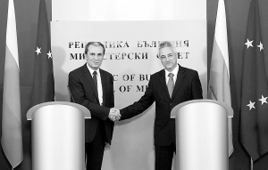 5月29日,在保加利亚首都索非亚,保加利亚新当选总理普拉门·奥雷沙尔斯基(左)与看守政府总理马林·赖科夫进行正式交接。
