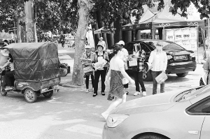 6月2日,5位散发广告的女士一字排开站在周口市区七一路与中州大道交叉口的慢车道上。