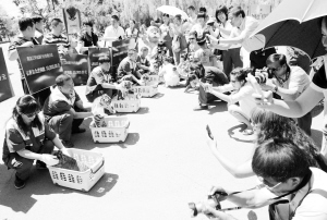 6月2日,市民、游客在认养的东北虎幼仔前拍照。