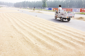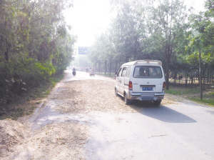 昨日,周口市区滨河路大庆路桥附近,不宽的路面被新收割的麦子占据,给司机和行人带来不便。 晚报记者 张洪涛 摄
