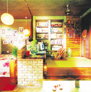 在这个不大的空间中,主人特别注意使用风格一致的家具,表现出自然的东南亚风格。例如,防盗门之后两扇造型古朴的木门、纹理做旧处理的小吧台、颜色暗沉材质做旧的吧台椅、造型自然原生态的床边小桌等。这些非装饰因素,自然整体地打造出原生态感觉。