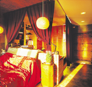 居室一进门是一个榻榻米,这个空间兼顾休息和工作,靠墙的书柜和衣柜给居室带来宽阔的视野。为了使用方便,主人将榻榻米与走廊、榻榻米与床之间设置了帘子,独到设计方便拉进拉出,绛红色的纱质材料,给空间带来一股热带风情。在榻榻米的对面,主人也为洗手间设置了布帘而非门,这样既保证了小空间中的大视野,也为二人世界带来一丝生活情趣。洗手间内,主人将盥洗池挪到外面,方便使用,也保证私密空间的面积。
