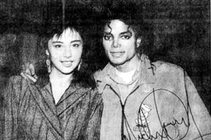 照片中,迈克尔·杰克逊右手搂着王祖贤的肩,王祖贤一头披肩短发和羞涩的笑容,看上去两人非常亲密。