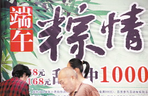 图一:市民从一家超市的端午节促销宣传海报前走过。