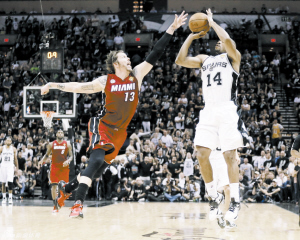 NBA总决赛采取2-3-2赛制,从本场比赛开始,马刺迎来3个连续主场。在昨天的比赛中,双方首节都主攻内线,分差一直没有拉大。马刺队充分利用了主场的优势,在首节中的3次扣篮十分提升士气,邓肯先抡臂单手暴扣,吉诺比利一上场就表演了突破后扣篮,斯普利特又接吉诺比利直传完成劈扣,首节主队以24∶20领先4分。