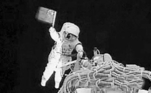 2008年9月26日23时36分,翟志刚身穿我国自主研发的飞天号舱外航天服在太空亮相,成为我国“太空漫步”第一人。