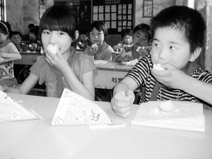 6月14日,在商水县平店乡刘营小学校二年级的教室里,农村孩子正在吃鸡蛋、喝牛奶。该县积极实施国家营养餐计划,很多农村儿童、留守儿童生活得到大大改善。(赵永昌 摄)
