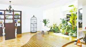 借鉴:石子铺成的阳台衔接原木地板的铺设,让自然风从室外延伸到室内;作为玻璃材质的镜子,有扩大空间的效果,让空间显得更宽敞和凉爽。