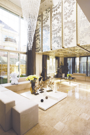 挑高的空间、安静的浅色卡其色调,让居住者的心开阔而放松。长而细碎的水晶灯自屋顶垂下来,旁边是银灰色的印花墙壁。简单的树叶花纹蜿蜒盘旋,让整个空间顿时具有了清爽的气质。