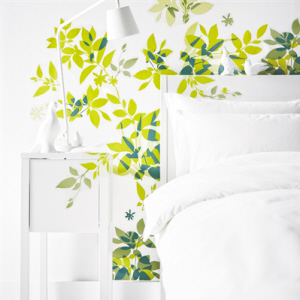 白墙加白床,再加上白色的床上用品,虽然色彩很淡雅,但若不加变化,空间会显得死板。一款绿色的墙贴简单地打破清冷感。黄绿、嫩绿、青绿以及深绿等近色系使用,让墙面不但绿得生机勃勃,而且层次分明。