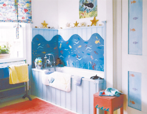 浅蓝色大浴缸本身就很清爽,深蓝色的壁画上有珊瑚、有鱼儿,还有波浪,摆在上面的海星、海螺以及带着波浪花纹的凳子,还有海洋味道的窗帘,将海洋的感觉释放出来。