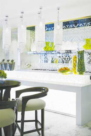 带着裂纹的玻璃台面,在灯光的照射下,如同闪闪发亮的水晶,让人眼前一亮。与台面相匹配的墙面,也采用镜面饰以蕾丝图案的白色花纹,如同进入了童话中的水晶世界。