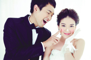 在室外拍婚纱照时,如果头部和身体如果成一条直线,难免会产生呆板的感觉。因此当身体正面朝向镜头时,头部应该稍微向左或是向右转一些,照片就会显得优雅而生动。同样道理,当新人的眼睛正对镜头时,让身体转成一定的角度,会使画面显得生气和动势,并能增加立体感。
