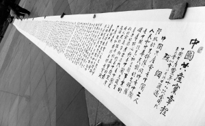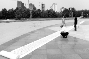 淮阳县郑集乡前张村的61岁老党员范登平,自今年5月份起,在自己打工住地,利用做工后的休息时间,历时一月,把两万多字的《新党章》用行书誊写下来,创作了一幅百米长卷,以此向党的92岁华诞献礼。