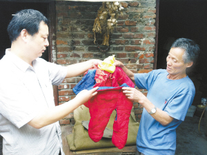 图:黄新民和邵战礼展示小黄杰当年被遗弃时身上盖的棉衣。