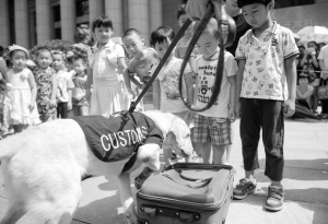 6月23日,在广州海关大楼前,小朋友在观看缉毒犬表演行李箱搜毒。