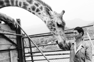 6月23日,山东青岛森林野生动物世界的工作人员与长颈鹿“长青”依依惜别。