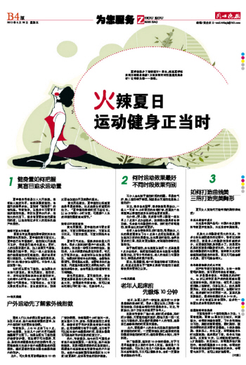 黄光民还建议,夏季运动比较适宜选择早晨或傍晚,地点选择在有遮阳的地方。“夏季运动持续时间不应过长,以30分钟到1小时为宜,可根据个人体质和运动强度适当调节。”