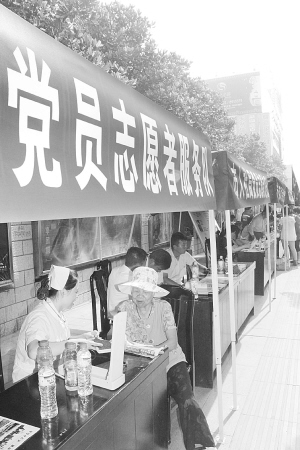 6月27日,周口市直机关工委组织市中级法院、市工商局、市食品药品监管局等16家单位的近百名党员志愿者,带着与市民生活休戚相关的法律法规条文、办事便捷程序等便民信息,在周口市区七一中路上“摆摊”服务市民。晚报记者 徐松 摄