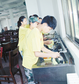 当天的晚餐是“小兵”们来到营地的第一顿饭,他们跟营地的兵哥哥一样,自己动手拿餐具、排队打饭,还要自己动手洗餐具、擦桌子……虽然有的小记者是第一次做这样的事情,但是他们的认真劲儿却令人称赞。