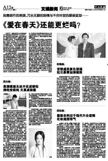 目前已然播到65集的《爱在春天》仍然没有看到大结局的希望,在白牡丹出现之后,这部剧已经开始完全脱离《我和春天有个约会》,而变成了一部《黑帮大嫂寻女记》,接下来又是《四朵金花抗日记》,一开始观众会以为《爱在春天》是一部姐妹成长剧、爱情励志剧,待播出之后发现这是一部糅合了虐恋、苦情、复仇、阴谋、抗日、偶像、潜规则、喜剧等元素的年度苦情伦理青春抗日喜剧。