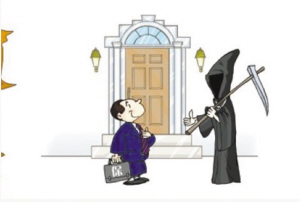 一个保险业务员到一位客户家推销保险,走到门口,看到死神也正准备要进去。保险业务员对死神说:让我先进去吧。保险业务员敲门进去了,过了一会儿,他又出来了,眼里全是失望和哀伤。死神说:好了,既然他们放弃拯救自己的机会,那我就该进去了。