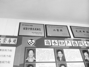 在该院一楼大厅的墙上,记者看到几块金黄色的匾额挂成一排,其中就有一块“诚信计量先进单位”的匾额(如图),上面写着:“授予:商水妇产医院诚信计量先进单位”,落款是商水县质量技术监督局,日期为2013年5月20日。