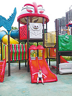 昨日上午,记者来到市直幼儿园东新区分园。因为幼儿园已于几天前放暑假,偌大的幼儿园很安静。走进园内,两侧是孩子们的室外游乐区,为了防止孩子们奔跑时摔倒受伤,地面铺的是柔软有弹性的塑胶跑道。院内设置的三四个大型滑梯(如图三)和篮球架,其材质都是高分子塑料,无毒无味,具有防水耐磨、抗紫外线老化、表面光滑强度大的特点,边角也都做了倒角处理,光滑无棱角。