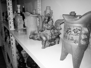 “‘扬州八怪’酒瓶,是我花了2000多块钱从信阳买回来的;‘马鹰酒’是‘马英九’的谐音,酒瓶上的图案由‘马’和‘鹰’组成,做工浑然天成,是上海世博会期间从台湾流传到内地的;‘板砖烧’酒瓶外形像块砖头,做工很原始,看着酒瓶就能让人体联想到蒙古人的豪爽和彪悍;‘瑶家三花酒’酒瓶是用竹子做成的,材质别具一格……”武新春说,闲暇时,她喜欢独自一人坐在收藏室内,回忆收藏酒瓶时的一点一滴,体味收藏带来的快乐。