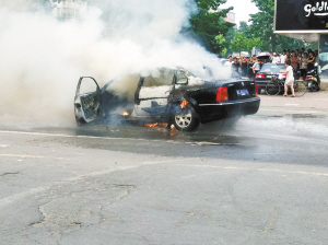 据目睹整个过程的一位环卫工人介绍,当时,她正在打扫卫生,看见这辆车突然停在路口,然后从车上下来一个30多岁的男子跑向交警。“这辆车一开始只是前面冒出很小的烟,但是,不知怎么一下就冒出很大的黑烟,然后在车头那儿先着起火来,随即整个车都着了,太快了,好端端的一辆车就成个空壳了”。