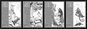 这套邮票为当代著名书画家范增先生手绘创作,以白描的手法和精湛的人物造型能力,描绘了中国古代关于琴棋书画的四个著名典故。高山流水,取自俞伯牙钟子期高山流水谢知音的传说故事; 弈秋课徒,表现古人学棋、专心致志;怀素临池,表现唐代书法家怀素少年练字的轶事;道子画壁,表现有画圣之称的唐代画家吴道子壁上作画的传奇故事。