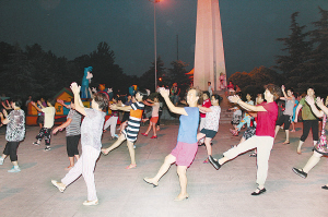 滨河公园民族广场上跳舞的“退休大妈”,衣着鲜艳,精神十足。