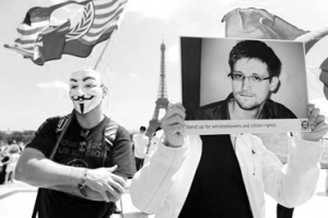 7月7日,法国民众在巴黎埃菲尔铁塔前集会,支持斯诺登。