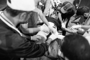 当地时间7月8日,在埃及首都开罗一个临时医院,人们救治一名在冲突中受伤的男子。