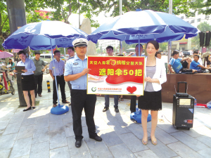 炎炎夏日似火烧,居高不下的高温天气,让人们不愿在户外多呆一会儿。凉风习习的空调屋里,成了人们心目中的“避暑胜地”。然而,最可敬的交警同志为了维护道路交通秩序,方便周口市民安全、有序通行,却依然在烈日高温下坚守岗位。交通警察为人民提供出行保障,天安人寿为人民提供人身保障,同为人民服务的行业。当看到这一情况后,天安人寿周口中心支公司决定,在首个“全国保险公众宣传日”这个特殊日子里,为全市执勤交警赠送岗亭遮阳伞及饮用矿泉水,以减少交警执勤人员工作的辛苦!