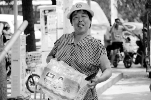 图一:领到云鼎鑫城发放的矿泉水,环卫工很高兴。 晚报记者 金月全 摄