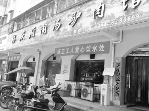 图三:建安路上的怀庆府闹汤驴肉馆专门设立了环卫工免费饮水处。 晚报记者 郭坤 摄