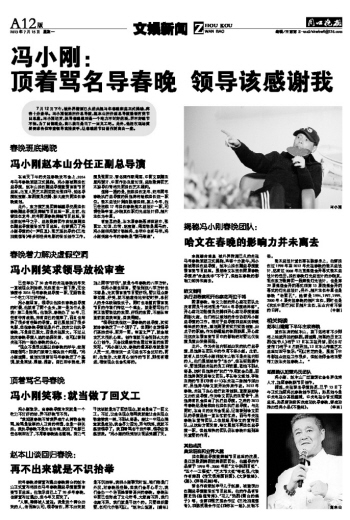 7月12日下午,被外界猜测已久的央视马年春晚班底正式揭晓,阵容十分豪华。冯小刚被聘担任总导演,赵本山担任副总导演兼语言类节目总监。冯小刚坦言,执导春晚绝对是一个吃力不讨好的活,弄不好晚节不保,为了回馈观众,自己就当是当了一回义工吧。此外,他还在现场笑着要求各位审查领导高抬贵手,让春晚的节目创作更自由一些。
