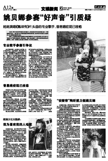 而作为舆论风暴的中心,姚贝娜对外界争议的态度十分淡然:“这些质疑其实来之前就已经做好充分的思想准备,我要接受这样一次挑战”。她透露自己最初参加《中国好声音》的目的其实十分单纯,“突破这两个字就是我这次来的目的,希望能有导师指导我,让我能够继续突破自己”。