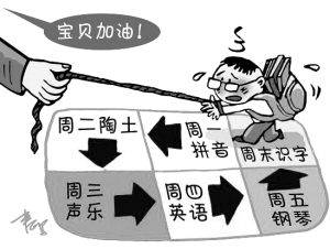 周一拼音,周二陶土,周三声乐,周四英语,周五钢琴,周末识字和数学……这个夏天,武汉徐女士为自己5岁半的儿子制订了周密的培优计划。从儿子半岁至今,徐女士先后为他报了17个培优班,累计花费近12万元,因此被称为“最着急”家长。