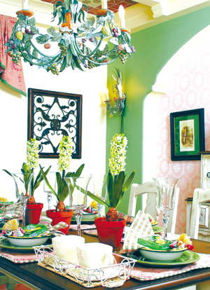 繁忙的工作是否令你的草地野餐计划一再泡汤?没关系,打造一个草地氛围的餐桌环境,就会叫你不再有遗憾。田园格子布餐垫、草编铁艺托盘、做旧的白色木质餐椅,大株的绿植环绕周围,耳边似乎传来了鸟儿的鸣叫。还有逼真的铁艺树叶吊灯,挂满的果实似乎伸手可摘。这些还不够?再倒上一杯自家酿造的葡萄酒……谁还会在乎是否真的要身临其境?