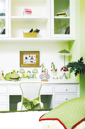 春色盎然的绿色墙面搭配白色家具,绿色森林系的大蝴蝶结布艺沙发套和各种有趣的饰品,美得叫人陶醉。绿色的盆栽将清新田园格调进一步演绎,天然竹编的收纳筐也映衬了纯朴的自然感觉,若隐若现的奶油色像盛开的花朵赋予自然无限生机。