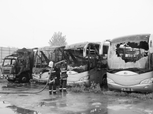 目击者赵先生说,起火时间大约是当天的17时30分许,靠近货车的一辆大巴着火后,火势随风向南蔓延,殃及另外两辆大巴。由于火势太大,旁边的货车也没能幸免,货车的车头部位很快就被大火吞噬,消防官兵赶到后,很快控制了火势,使得大火没有继续蔓延。