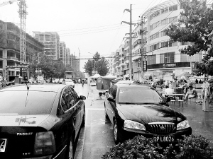 当天的雨没有把出店经营者赶进门店,也没有让大排档老板收摊。因为这些占道经营者的店里、车上早就备好了帐篷和大伞。帐篷和大伞搭起了一个个饮食点,降雨丝毫影响不了摊主们的生意和食客们前来大快朵颐的兴致。