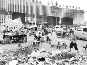 尽管本报对这里的脏乱差报道过多次,我市有关部门也对这里治理过多次,但是当天这里呈现的情景仍然让人大失所望。而且,这里还存在一个非常奇怪的现象:交叉口以东不远处,有关部门专门设置的小吃市场里没有一个摊贩,道路两边却到处都是。